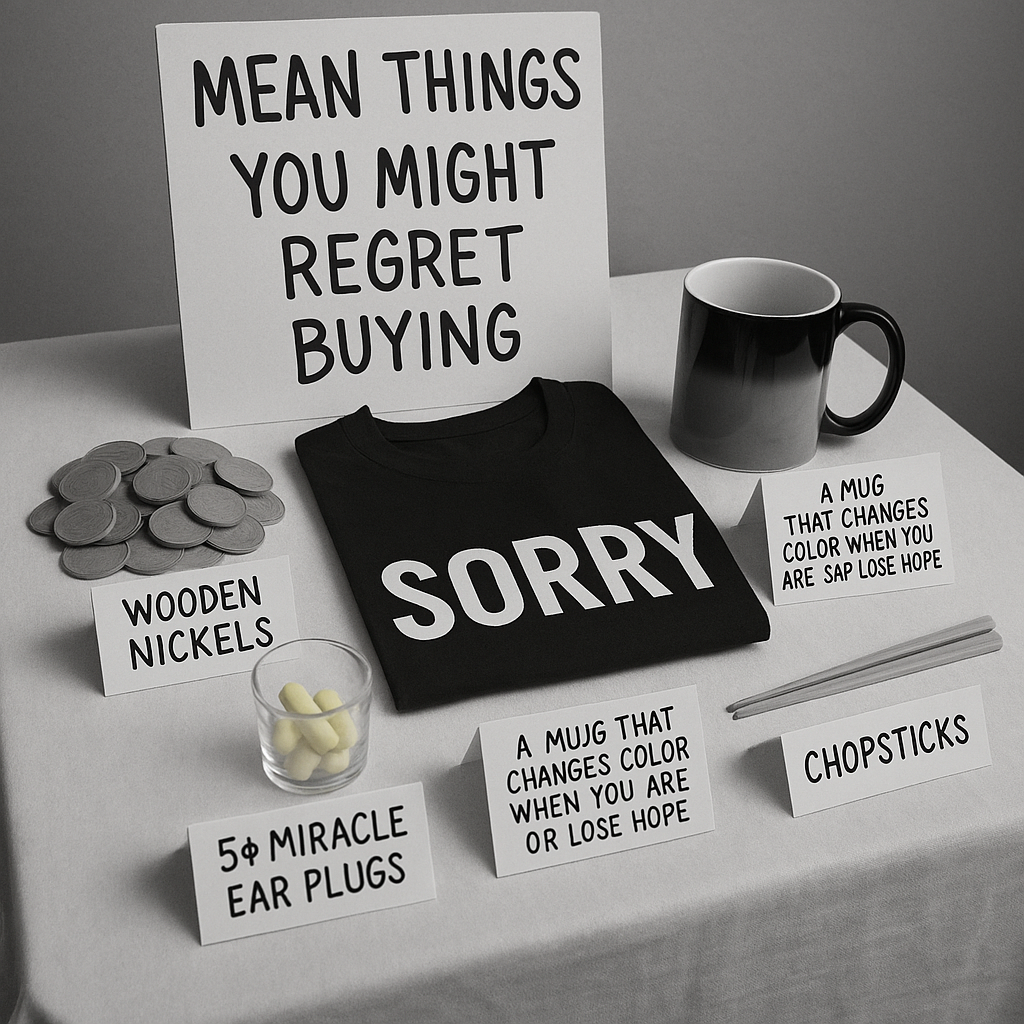 We understand you may feel compelled to support us, but please, think twice. When you purchase our merchandise, you are not investing in the future of music; you are simply ensuring we can afford new guitar strings. Buy responsibly, or better yet, just give us 5¢ and save yourself the clutter. Some of the merch we considered: